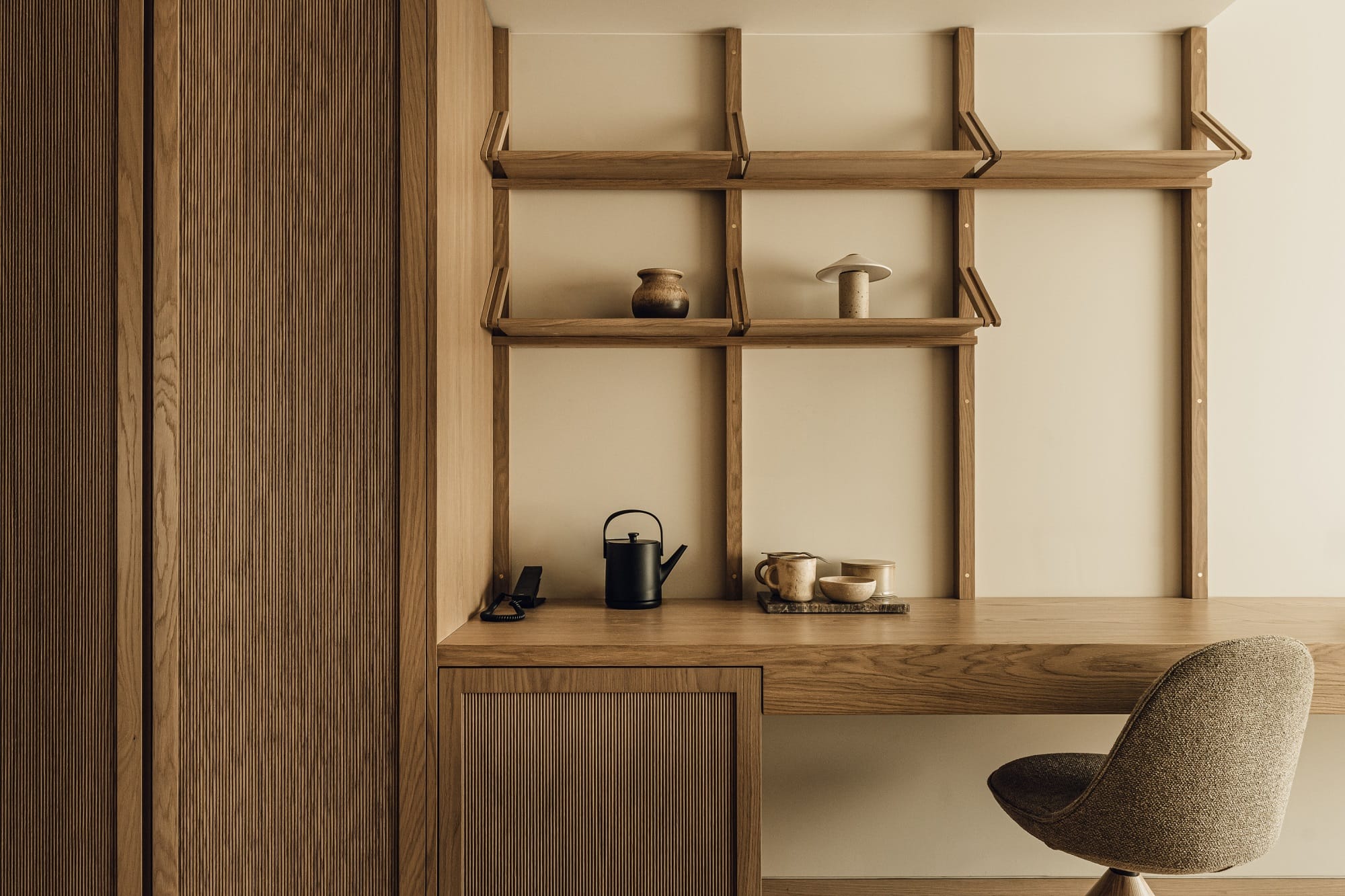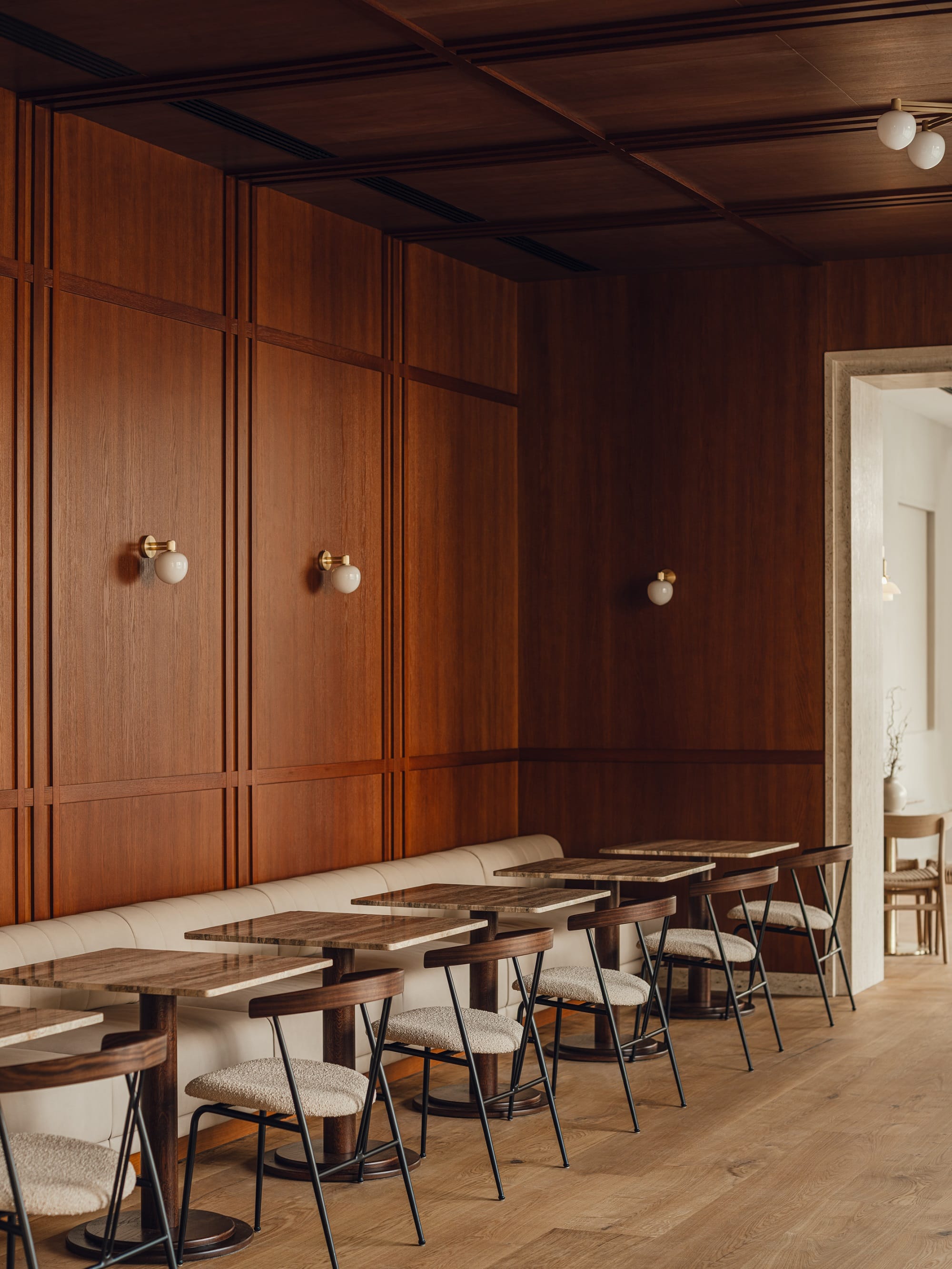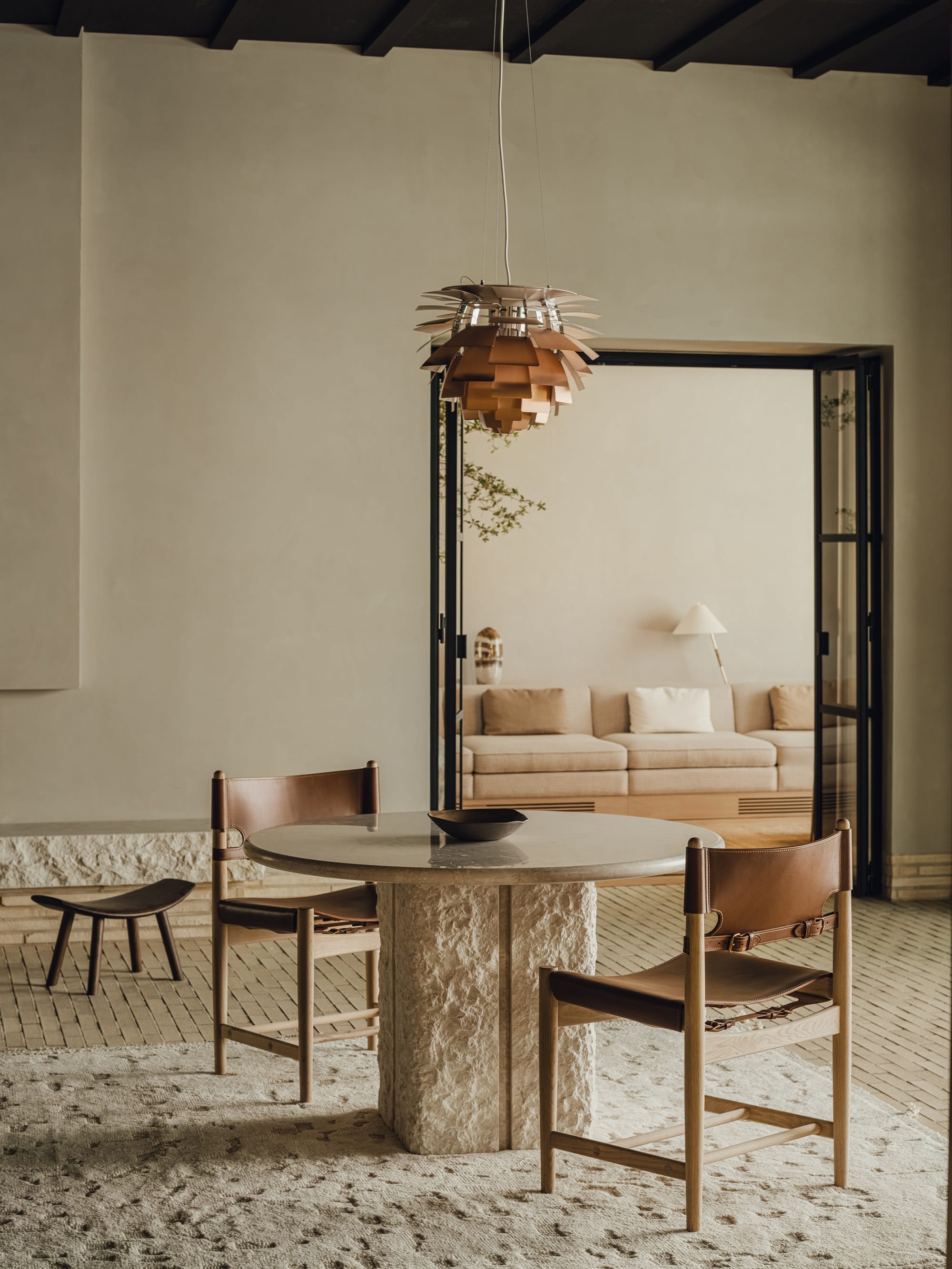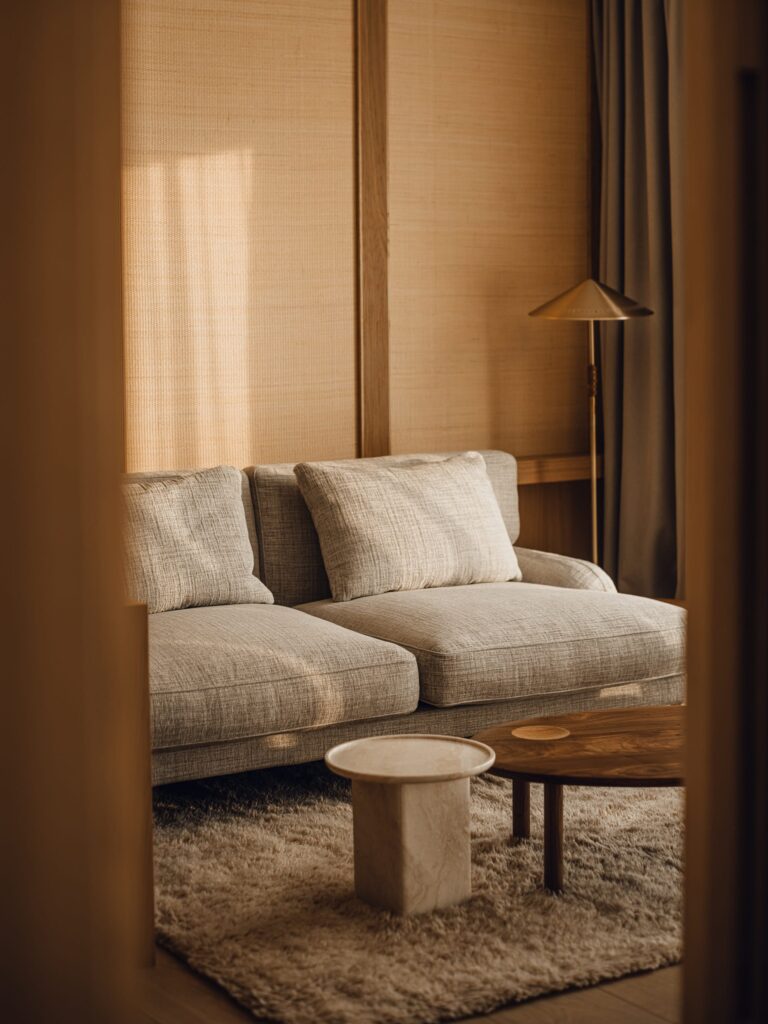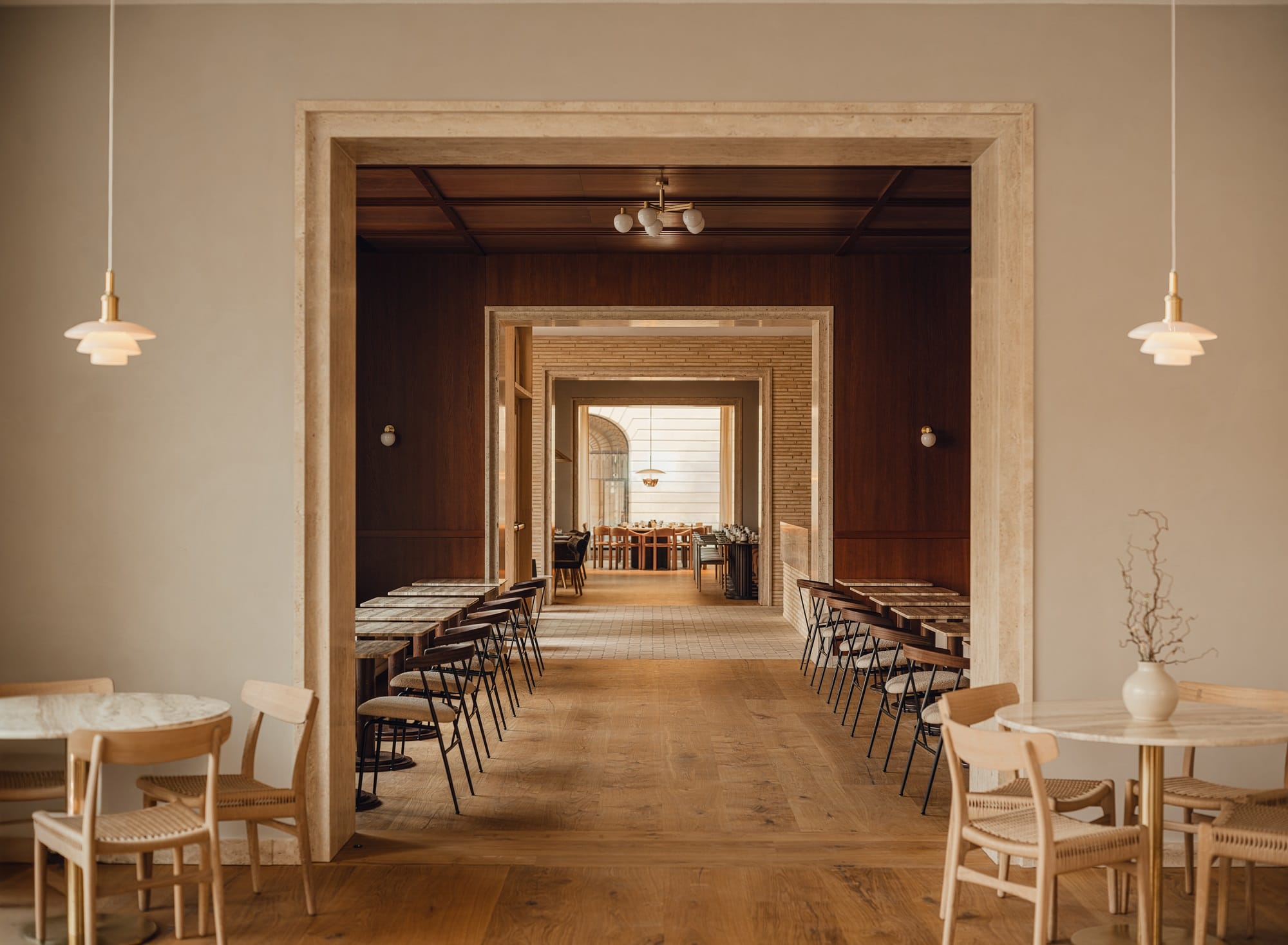 Wnętrza wyposażono w meble i oświetlenie marek Gubi, Louis Poulsen, Carl Hansen & Søn, Fredericia czy japońska Koyori. Uzupełniają je naturalne wykończenia – trawertyn, forniry i drewno Dinesen.
